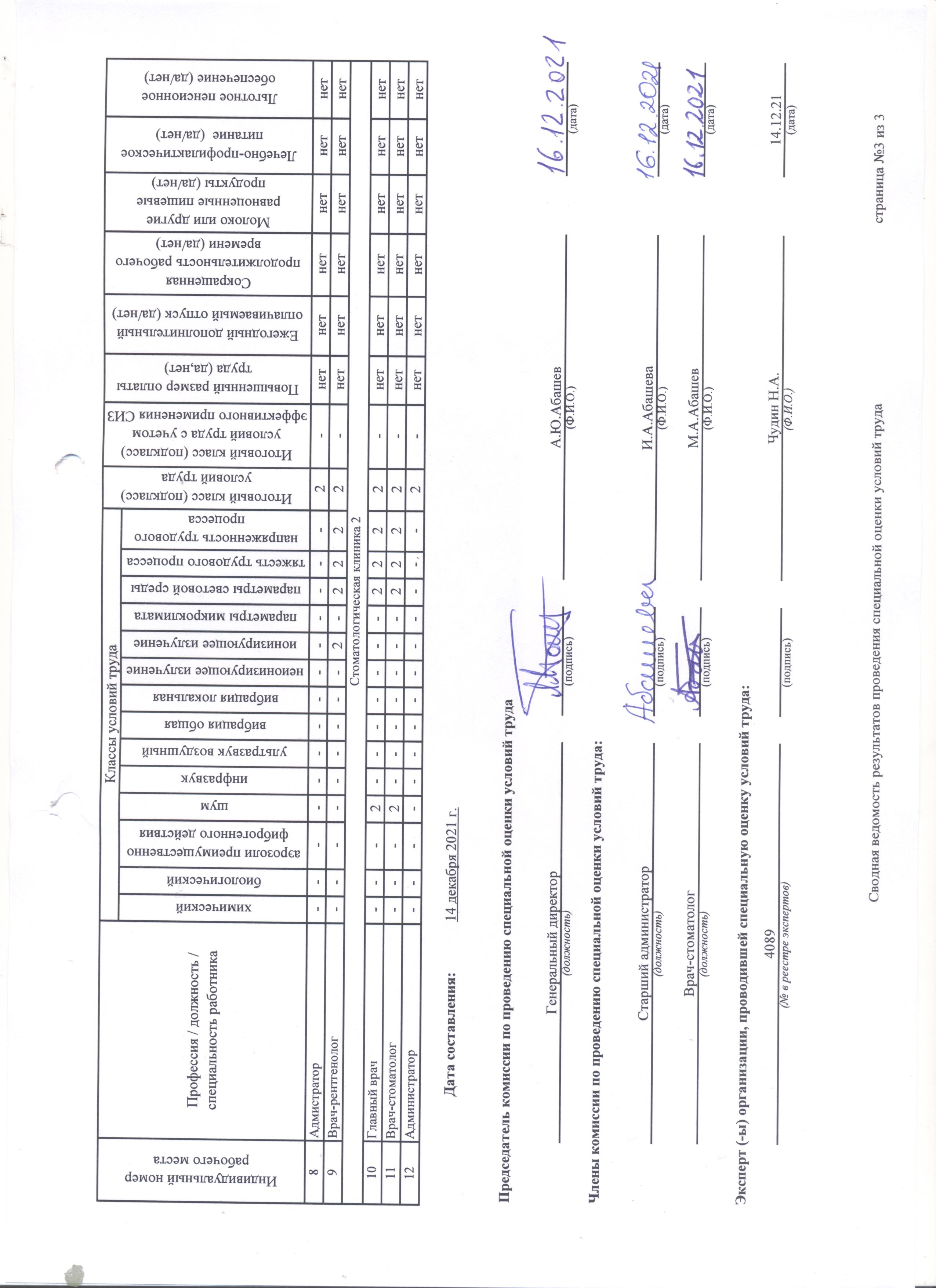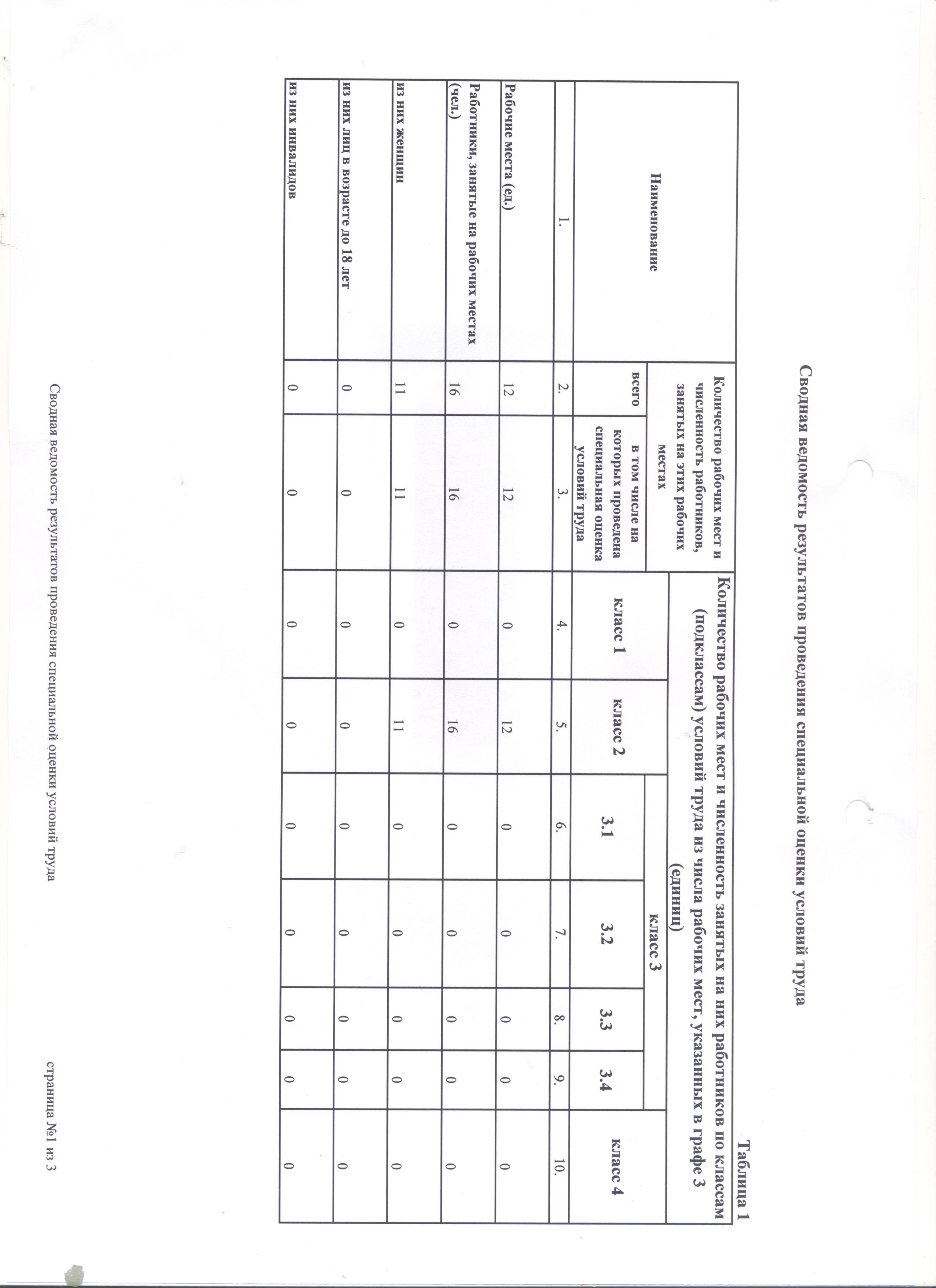 Сводная ведомость результатов проведения специальной оценки условий труда